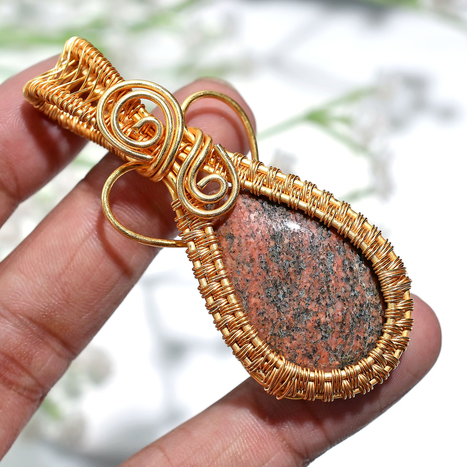 Crafted for both beauty and balance, this Unakite pendant features natural tones of pink and green in a golden wire wrap—perfect for healing and everyday wear.